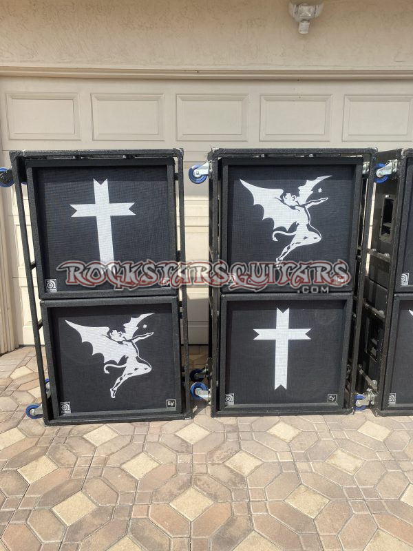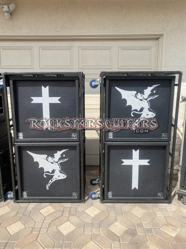 These are Geezer Butler’s four Ampeg stage cages, each containing one 4×12 cabinet and one 2×15 cabinet, used during the Heaven & Hell tours in 2009 and 2010 with Tony Iommi, Ronnie James Dio, and Vinny Appice. This setup marked the first appearance of the iconic Cross and Flying Devil artwork on Geezer’s cabinets. All cabinets are loaded with Electro-Voice (EV) speakers. The cages and cabinets can be seen prominently in numerous photos and live videos from the 2000s Heaven & Hell era — an incredible and historic piece of Black Sabbath legacy.