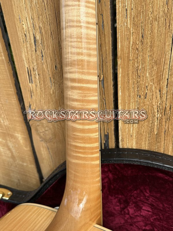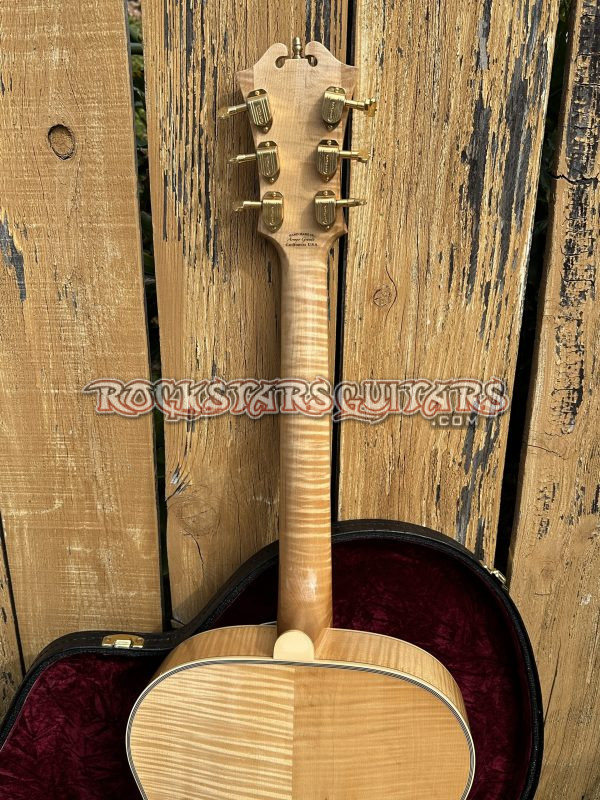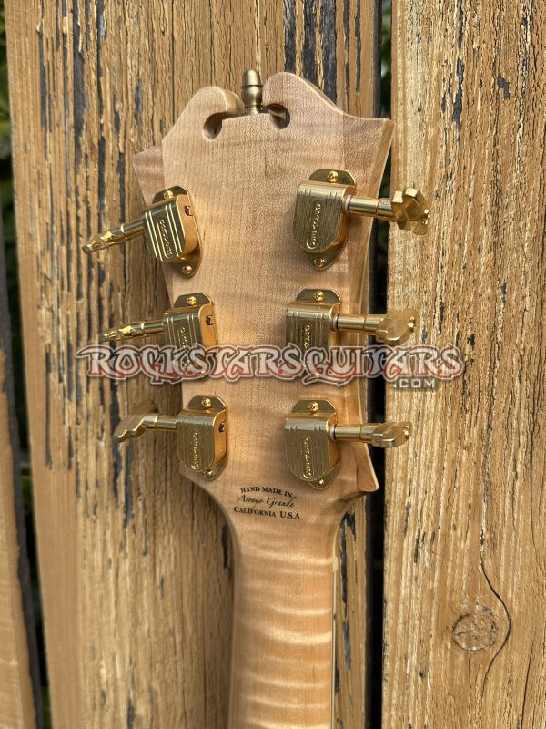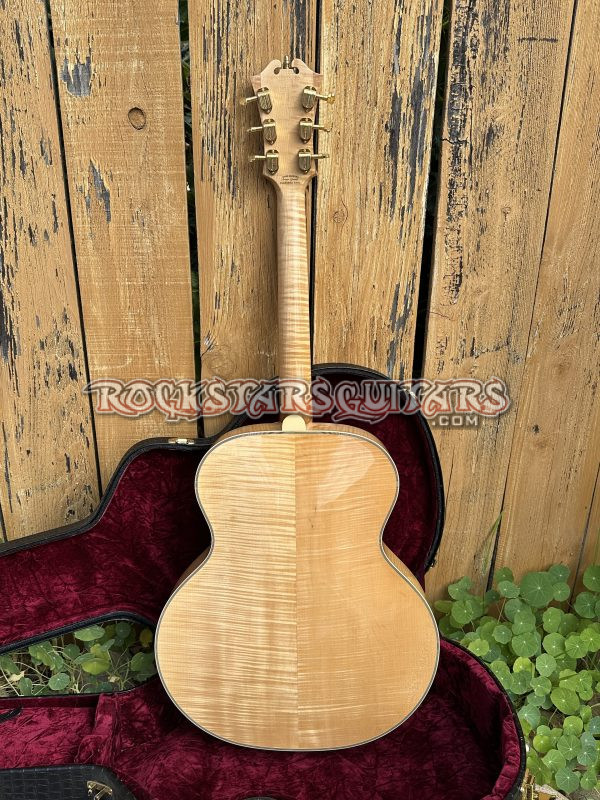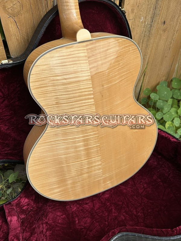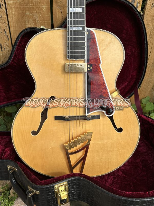 This beautiful guitar features a fully carved spruce top, highly flamed maple back and sides, a one-piece flame maple neck, and an ebony fretboard. It’s also fitted with a floating Lollar Johnny Smith pickup, with the controls mounted on the pickguard to keep the top clean and resonant. Other details include Grover Imperial tuners and a classic D’Angelico-style trapeze tailpiece. The body is a full 17-inch archtop, just like the originals. Sound-wise, it’s got that classic vintage archtop tone, warm and mellow, but still clear and punchy with great balance.