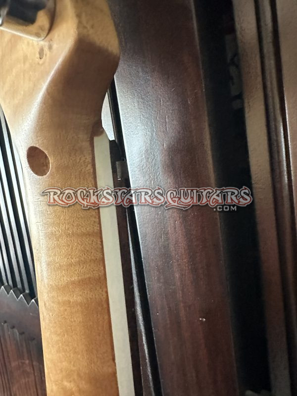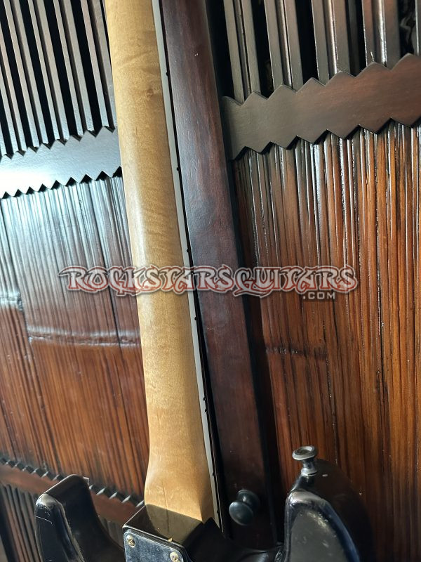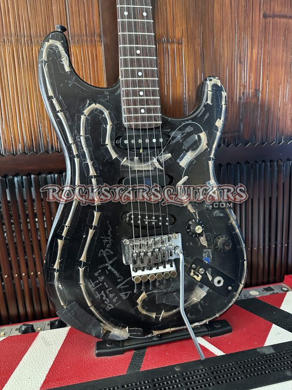 “Once I joined the Michael Jackson BAD Tour in 1987, I brought the guitar in to be used for “Beat It.” MJ had us tune down to a low C for the live show, so I needed a separately tuned guitar from the rest of the show. I also needed the guitar to be fitted with fiber optic fibers that would connect to a computer. The computer operator would then change colors within the fibers as I moved across the stage. My tech, Jage Jackson, opted to tape the fibers onto the guitar body rather than route wood out of it. He did route a channel in the sides of the neck to insert the fibers. After the tour, the neck was removed and put on a guitar that builder John Ashton made for me. I had gems from my late mother mounted into the guitar body and one mounted into the headstock. The one in the headstock fell out and disappeared at some point, but the carve-out remains. John also covered the routed neck channel with a binding. The Floyd Rose nut was removed since the new body it was inserted into had no locking bridge. The fibers were also attached separately to a headdress that was worn for that tune and would also change colors as I moved.”