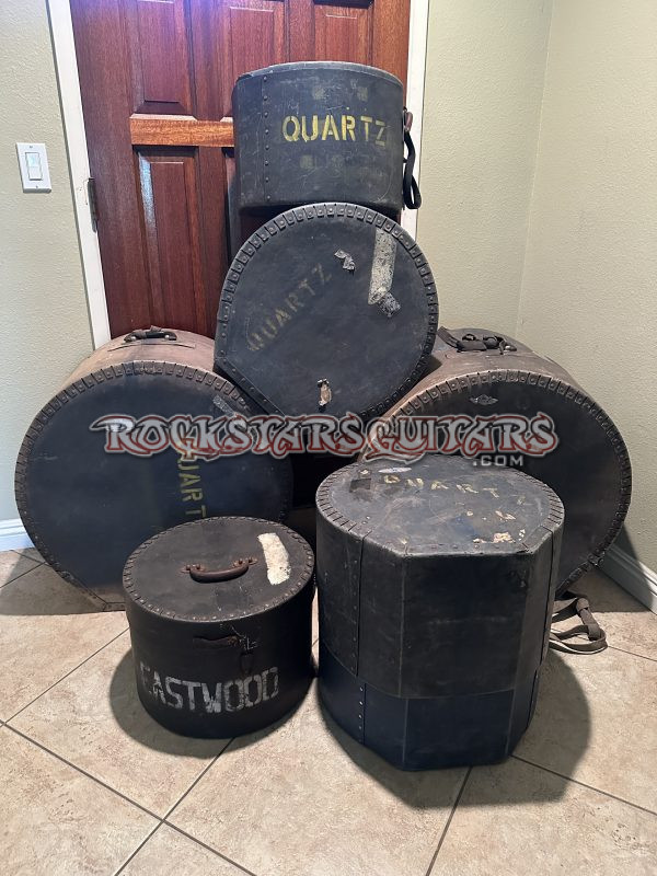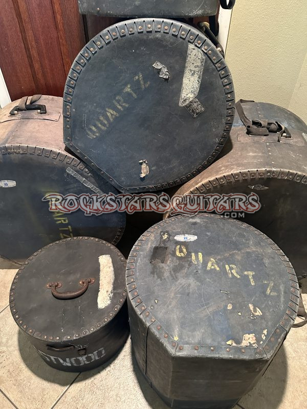 The kit is also prominently featured on the cover of the band’s live album, Live Quartz. Included are a photo of Malcolm with the kit and a black-and-white photo of Quartz performing at the Hammersmith Odeon in London in 1978, when they opened for Black Sabbath. All original drum cases are included. A detailed letter from Malcolm is also included. This is on cool kit!