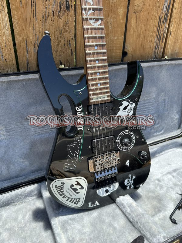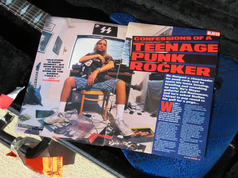 This is Jeff Hanneman’s 1994 Ibanez JEM 555. S/N C405866. A longtime admirer of Steve Vai, Jeff purchased this JEM 555 immediately upon its release in 1994 and used the guitar in his home recording studio. The instrument remains in the exact condition it was in when Jeff last played it, with all decals personally applied by Jeff. This is the only Ibanez guitar Jeff ever owned.