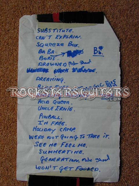 RARE! This is a rare circa 1976 hand written Who set list with cues for Roger Daltrey, including harmonica keys and tambourine prompts for the crew to hand him the correct gear at the right time. Best crew in the world we were told.