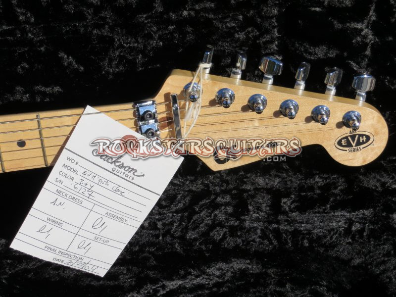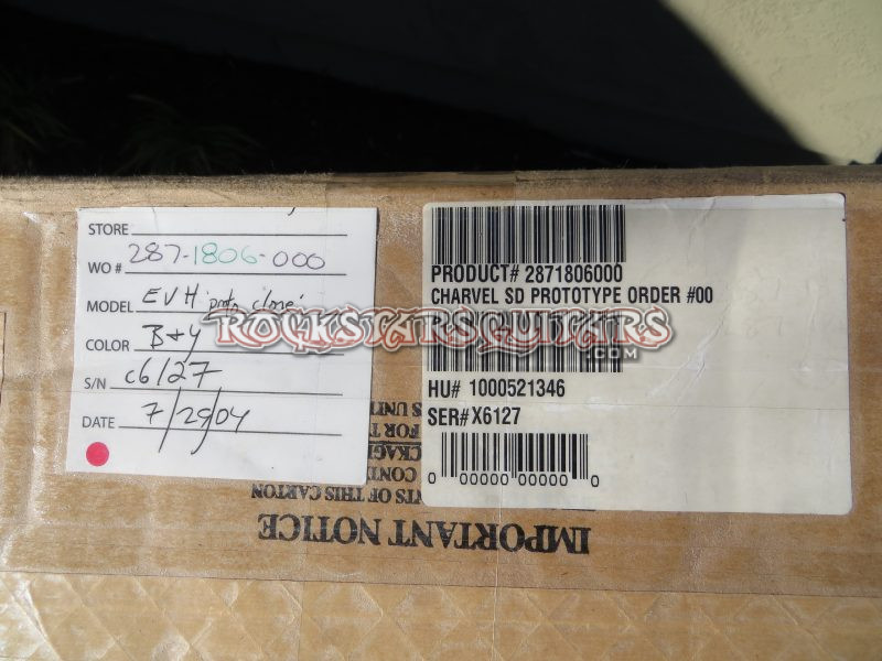 This 2004 Charvel EVH Art Series Black & Yellow “Prototype Clone” was produced for Eddie Van Halen to personally inspect and approve ahead of the final Art Series production run. Built as a pre-production example, this instrument represents an important developmental piece tied directly to the launch of the 2004 EVH Art Series models. Designated as a Proto Clone, the guitar was created specifically for evaluation purposes, reflecting the construction, graphics, and specifications intended for the production series. Such prototype examples were made in limited numbers and used internally for final review and sign-off. It is accompanied by its original Fender/Charvel shipping box, original case, and original factory work order tag.
